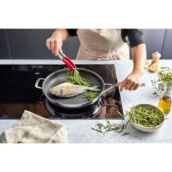 - Geschikt voor alle kookplaten, inclusief inductie, tot 230 °C. Niet gebruiken onder de grill en niet in flamberen
