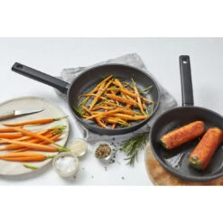 Met deze set pannen (20 en 24 cm doorsnede) gaat bakken als vanzelf. Beter nog: je hebt heel weinig vetstof nodig voor een rijke smaak. Zalmfilet, worstjes, kipsatés, groenten, eieren en tofu … Noem maar op, alles lukt in deze makkelijk hanteerbare pannen uit de Alu Comfort 3 serie. Reinigen is zo gebeurd.